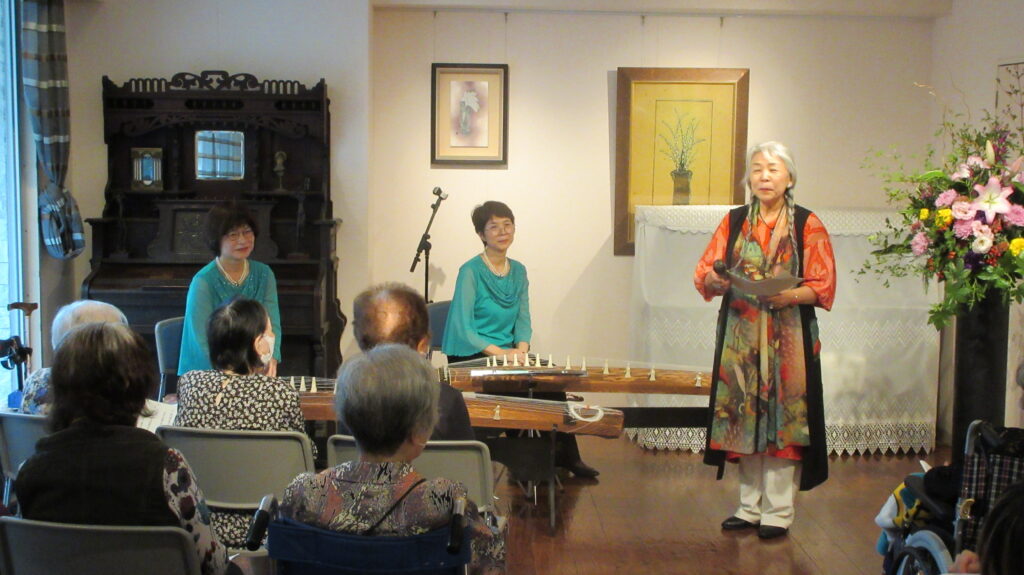 後半部分は、他の回でも幾度か演者として参加いただいている博多 宮己様がリードしつつ、入居者様もご一緒に唱歌3曲を歌っていただきました。